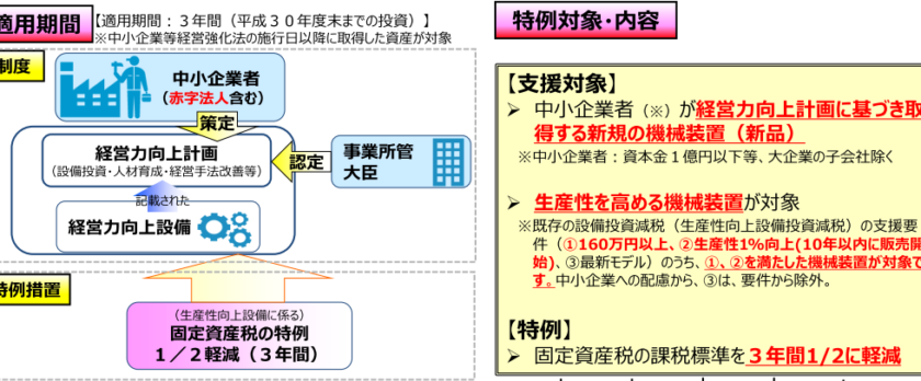 計画認定を受けた場合、資本金1億円以下の会社、個人事業主などは、①160万円以上の機械及び設置であって、②生産性が年平均1%以上向上等の要件を満たせば、固定資産税の課税標準が3年間半額になります。