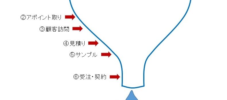 ①顧客リストアップ → ②アポイント取り → ③顧客訪問(商談)→ ④見積り → ⑤サンプル提供 → ⑥契約・受注 → ⑦納品・売上げ