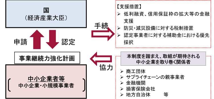 中小企業診断士の桑原です。「事業継続力強化計画」とは、中小企業が昨今のコロナショック、インフルエンザ、台風19号、自然災害等による事業活動への影響を軽減することを目指し、事業活動の継続に向けた取組を計画するものです。経済産業大臣から計画の認定を受けた中小企業は、防災・減災設備に対する税制優遇、低利融資、補助金(ものづくり補助金等)の審査上の加点等の支援を受けることができます。